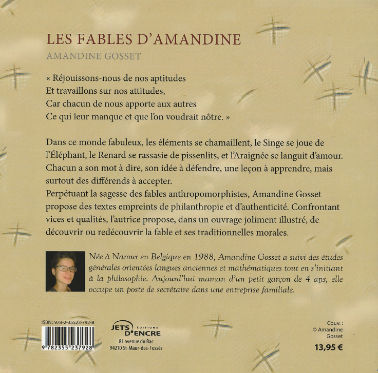 Chacun a son mot à dire, son idée à défendre, une leçon à apprendre, mais surtout des différends à accepter. Perpétuant la sagesse des fables anthropomorphistes, Amandine Gosset propose des textes empreints de philanthropie et d'authenticité.